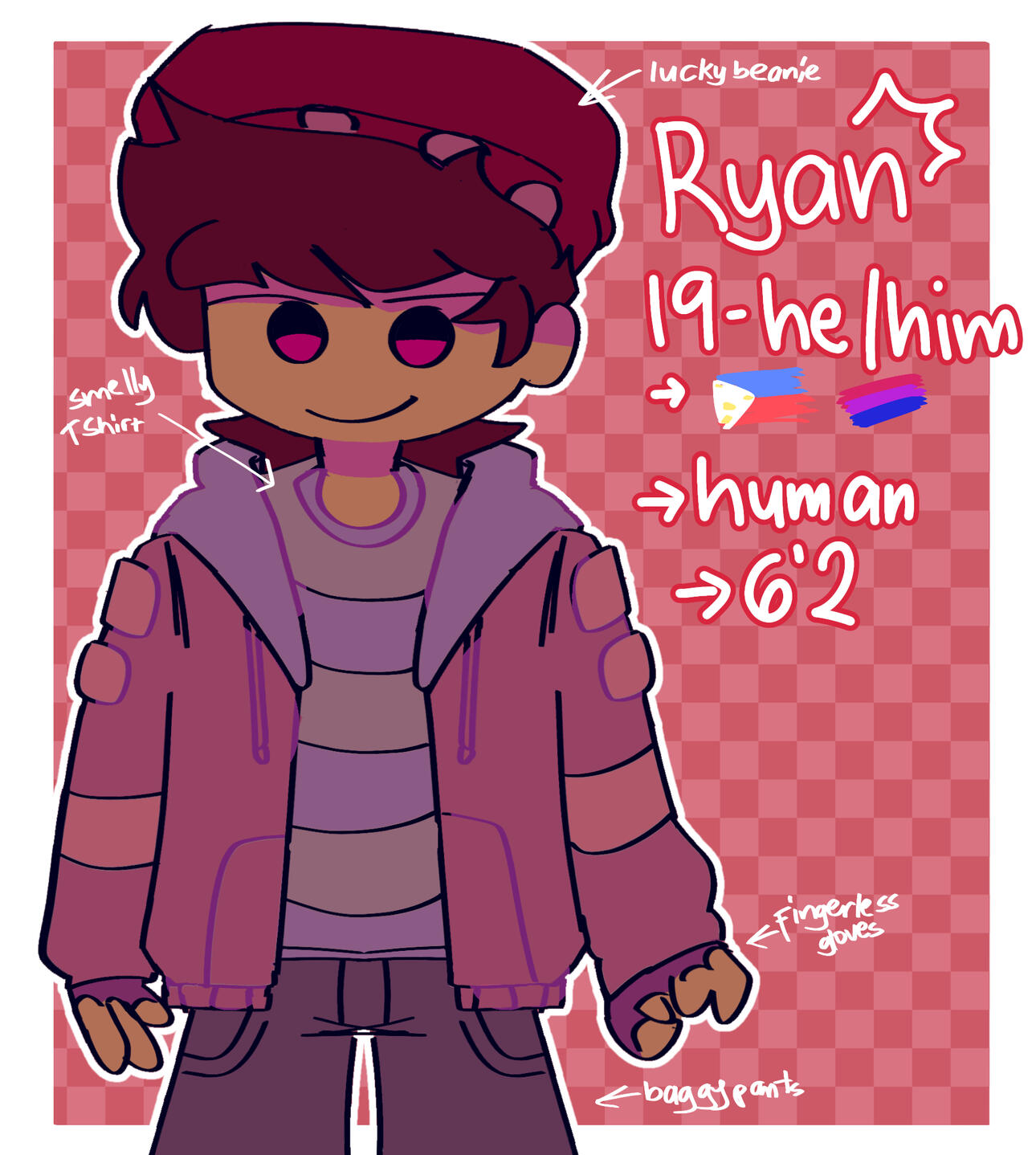 age: 19sexuality/gender: straight / maleheight/species: 6'1 (human)pronouns: he/himpersonality: energetic, enthusiastic and proudbackstory: After losing his parents at a young age, Ryan is now in care of his filipino grandma. He had alot of school fights when he was in elementary which led him to be expelled in his school.current status: Now in college, he shares a dorm with his best friends Seth and Liam, he is seen as a big brother figure due to his loyalty and generosity. He's also known as a streamer mainly focusing on rpg games. He mostly yells at losing games because he's not really what you call a "sport". He curses excessively mostly because of his rage fights online. Ironically, he has a normal sleep schedule even though he streams daily. He sees Seth and Liam as his closest brothers. Though his annoying demeanour he can support you in hard times. He's much an idiot because he doesnt think fast. He has an obsession over roleplay games but sucks at shooting games. He cosplays frequentlyRelationship: with Marisol ❤️💛