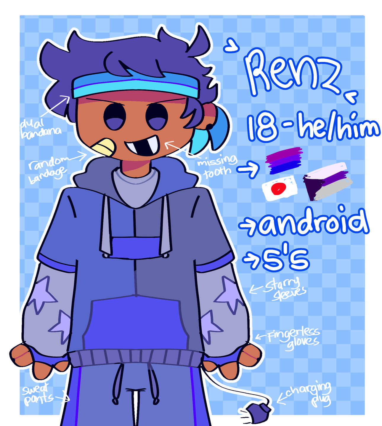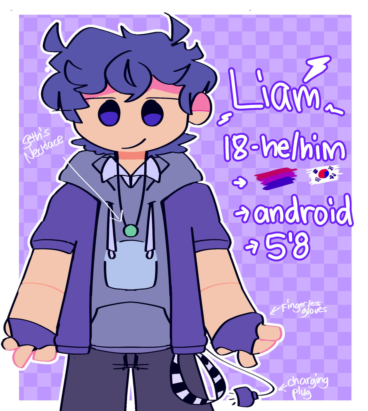 age: 18sexuality/gender: bisexual / announced maleheight/species: 5'8 (android)pronouns: he/himpersonality: sweet, protective, slightly airheadedbackstory: an android formerly assigned as a military unit, soon escaped from it after realizing what his true purpose wascurrent status: was soon helped by his friend Seth who gave him maintenance fixes, and to help him recover his traumatic experience, currently lives in a dorm with Ryan and Seth. He spends his time off usually drawing and loves watching korean dramas. He also loves being with his friends all the time, as they all tread him like any other person rather than being treated a criminal. He feels grateful for this. On some occasion he treats his buddies to the nearby amusement park, but he's not a fan of rollercoasters. He does enjoy carousels though. He dislikes being teased about being an android, and relatively doesnt know whats teasing from light jokes. He doesnt get the idea of sarcasm or satire so he takes some stuff seriously.Relationship: with Seth 💚💜