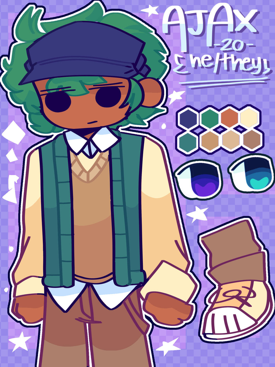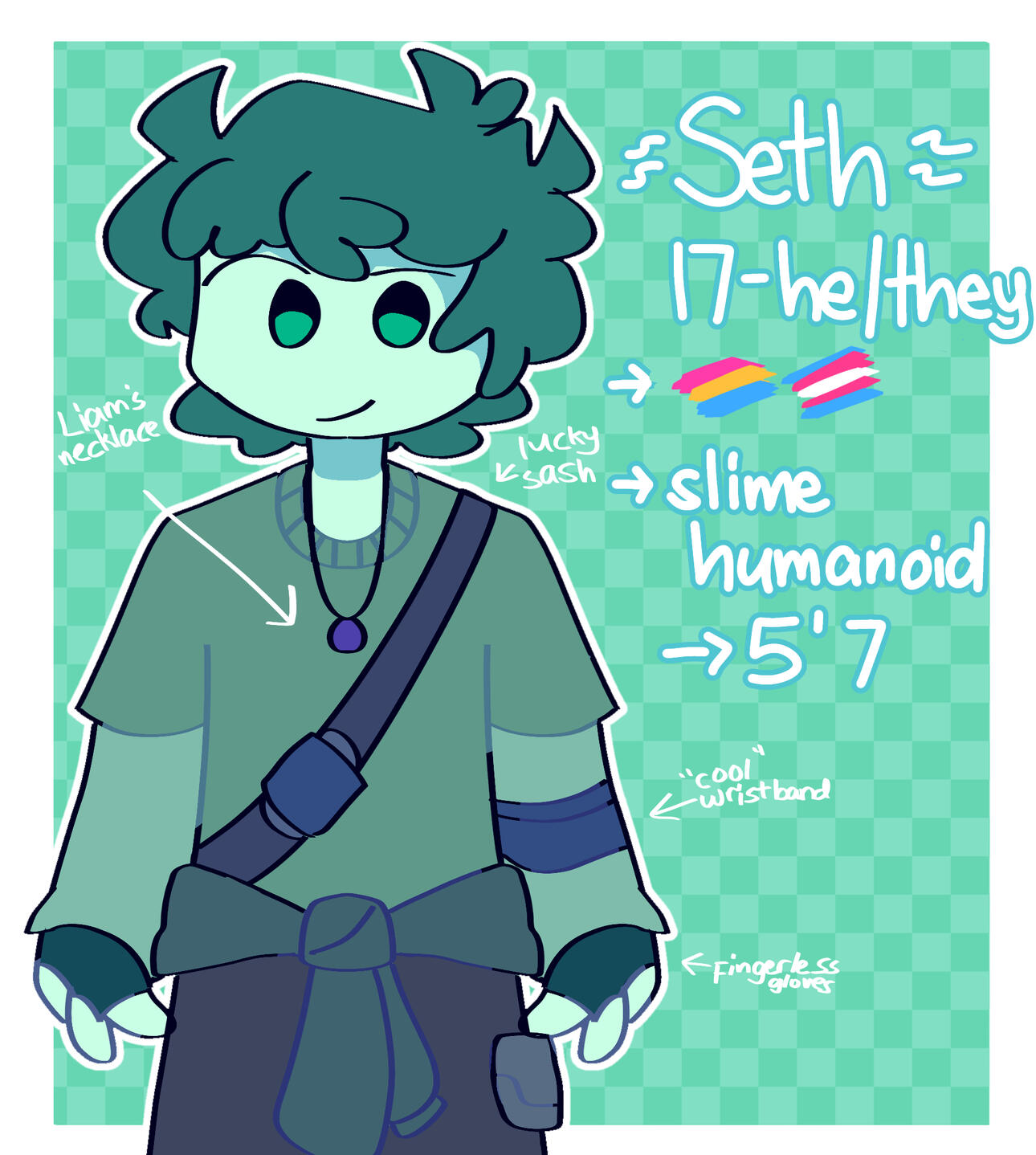 age: 17sexuality/gender: pansexual / maleheight/species: 5'7 (slime)pronouns: he/theypersonality: chill, lazy, laid backbackstory: A slime humanoid that had a normal childhood, raised with good morals and common decency. He's been known to be really sleepy at math classescurrent status: His new life started when he met a Liam at his doorstep. He offered him kindness too. He currently lives in a dorm with Liam and Ryan. He loves listening to jazz genre, as such he's a jazz music producer. He spends his time writting off stories based on historical events. He also has a thing for robotics, he's not a genius in computer programming but it's something. He can be found mostly dozing off at the sofa, and his very much lazy attitude towards the group, but he's unaware. Seth's clear chill minded personality has stopped him from raging frequently. He had some anger issues once. His "slime" can heal off any substances whether its wounds or broken bones, he can miraculously heal them. He and Liam both share twin necklaces to symbol their relationshipRelationship: with Liam 💚💜
