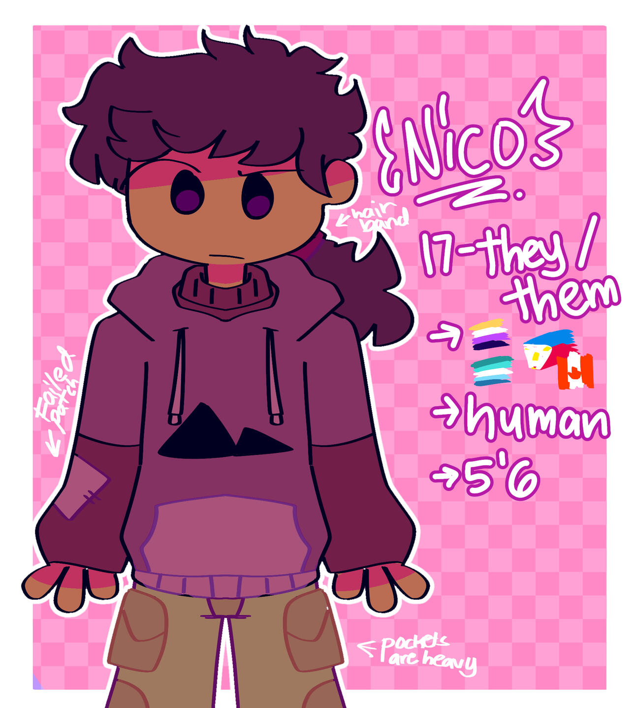(real name: Reimarc Nicolas Gonzales)age: 17sexuality/gender: gay / non-binaryheight/species: 5'6 (human)pronouns: they/thempersonality: stubborn, immature and a bit mischievousbackstory: born to a wealthy family, nico had been spoiled, they had everything they wished, but when their parents were bankrupt because of a single gamble, they were forced to move in their cousin, Ryan. Definitely no knowledge of common life, Nico struggles pretty much especially on their new college lifecurrent status: still the clumsy guy they were, Nico did change for the better, and he was a little selfish than before. Their boyfriend Temp is annoyed of their flirty personality, and nico is unaware. Nico likes playing old retro games and has made 3 games out of it. They also have mild autism but they usually ignore that. They kinda have social anxiety on the way, so they're a bit comfortable with the people they know more. They love watching old Disney princess movies too, says they "love the creative fantasies". They're really interested on baking but it didnt work out for them. They have a sweet tooth though.Relationship: with Temp 💙❤️