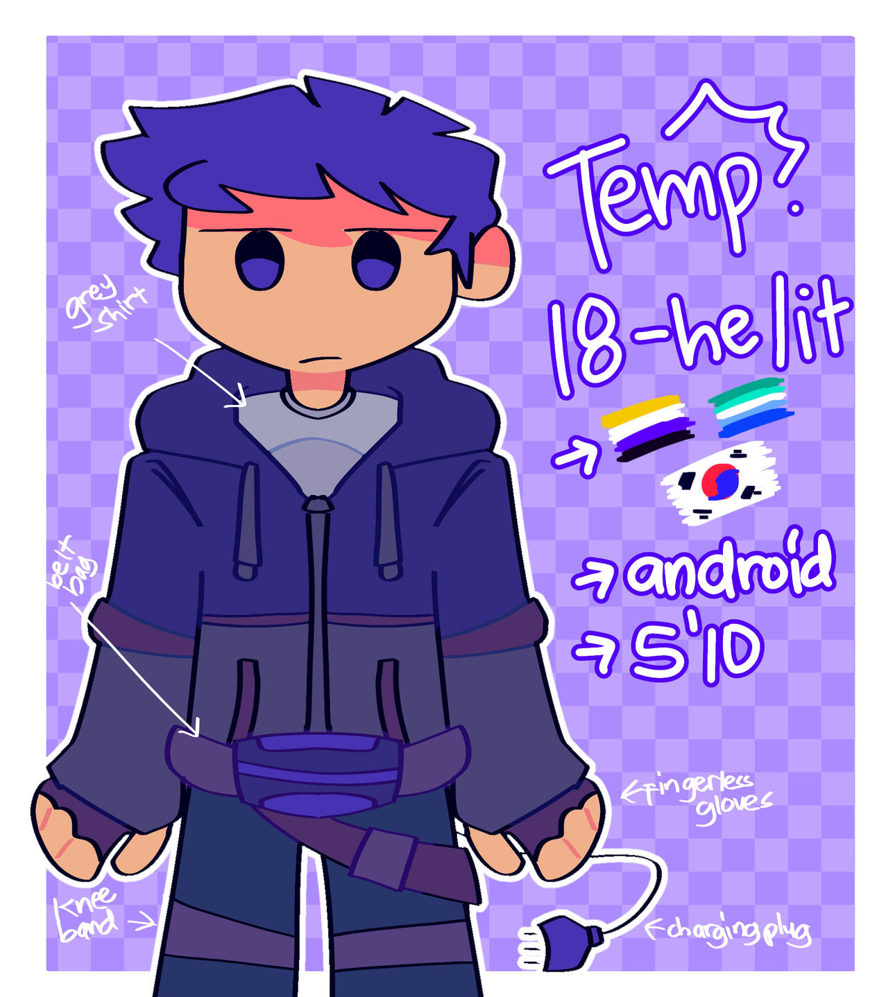 age: 18sexuality/gender: greysexual / non-binaryheight/species: 5'10 (android)pronouns: he/itpersonality: cold hearted, stoic, mysteriousbackstory: from creation, temp has been a well-known assassin, mostly for its techniques of eliminating targets, he was a merciless killer, because of his human like appearance, he can easily fool people and uses his own tricks to lure its targets. He has successfully killed targets and has never failed. Some days ago it was assigned to a very risky task of killing its creator. An accident happened that time that led him to be deactivated, no one knew not even Temp what happened that time. He was in "deep sleep" for who knows how long. Accidentally deactivated by Nico, he has no choice but to "serve" him because of Nico's act. He has changed after that.current status: After his awakening, he stopped doing his job. He didn't really change his personality, but efforts are noticed. He has rare music tastes such as 80's jazz and classical. He enjoys collecting stamps on its free time. He rarely interacts with people around him (except Nico). He speaks in a monotone voice, sometimes soothing if you had the chance to ask him. It's difficult if you get Temp to ask about his past, though sometimes saying specific words triggers it, makes him rage. He strongly hates cosplays of the thought of "wearing ridiculous outfits at sardine filled rooms". He brings his own bag with tools he use. He often lies too, he's not the person to trust anyone.