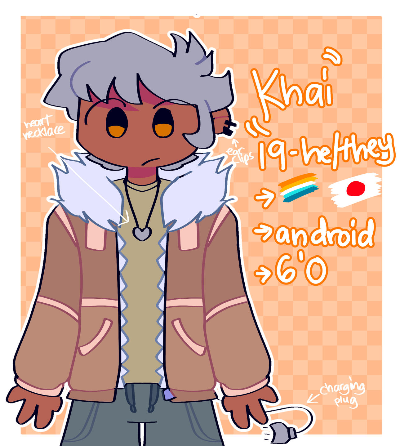 age: 19sexuality/gender: aroace / assigned maleheight/species: 6'0 / androidpronouns: any pronounspersonality: extremely shy, but kind. silent (emotionless??)backstory: He remembers nothing of his past. He only knows that his voice got broken.current status: Currently Khai is off searching for his lost memories and his purpose. He's too skilled at anything to know, cooking is his experience. He's had difficulties with talking, rarely even talking. If you can, you'll get to hear him say short phrases. He likes reading books about birds at green parks. He usually avoids people, but he isn't rude to them, but he can be kind when he sees you with "no harm". He believes that "actions can speak louder than words". He does favor a few things. The sound of soothing crispy bread that he likes to eat. He also has a camera on which he takes random pictures of strangers having fun. He sometimes study human life but thats not his main thing. He often bumps into Renz and Ryan, they usually keep Khai from feeling lonely, and they're doing a pretty good job at it, he trusts those two alot.